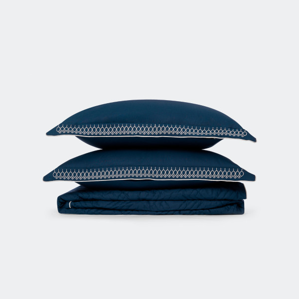 Màu xanh navy thường liên tưởng tới sự bay bổng, nhưng lại được “căn chỉnh” lại bởi những đường thêu viền thẳng thướm. Tính tình của con người cũng vậy. Người có cho mình “Nét khiêm tốn”, tức là người biết giữ lại những điều tốt, không khoe khoang, không tự cho mình là đúng. Có như vậy, trí óc và tâm thế mới được thông suốt.